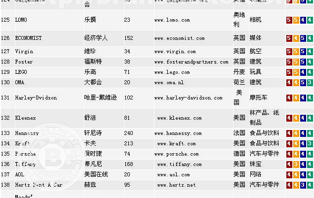 世界品牌实验室(World Brand Lab)按照品牌影响力(Brand Influence)的三项关键指标:市场占有率(Share of Market)、品牌忠诚度(Brand Loyalty )和全球领导力(Global Leadership)对世界级品牌进行了评分,1分表示一般,5分表示极强。
