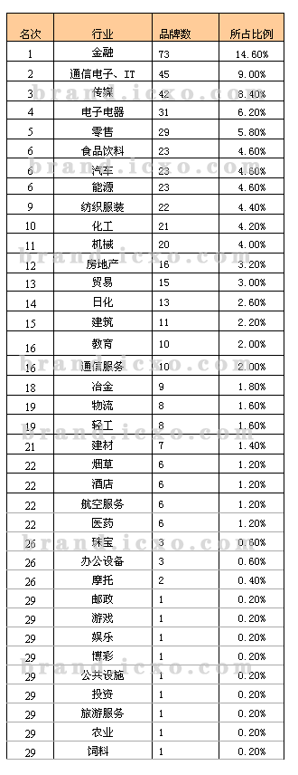此次入选亚洲品牌500强的品牌共涉及37个行业。其中入榜前十名的行业为:金融业73个,占14.60%;通信电子IT业45个,占9.00%;传媒业42个,占8.40%;电子电器业31个,占6.20%,零售业29个,占5.80%,食品饮料、汽车、能源均为23个,分占4.60%;纺织服装业22个,占4.40%;化工行业21个,占4.20%。